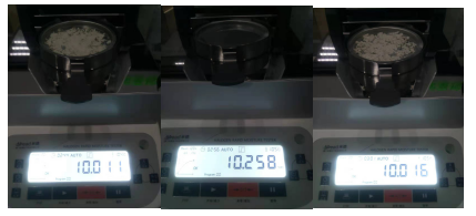 3.用實(shí)驗(yàn)勺取6.643克重的氟化鈣礦粉(A3樣品)均勻鋪在樣品盤上,設(shè)置好合適的溫度后蓋下上蓋,按下“START”鍵開始測(cè)試;蜂鳴兩聲后,儀器自動(dòng)停機(jī),測(cè)試結(jié)束,可在液晶顯示屏查看測(cè)試后氟化鈣礦粉的水含量為10.011%;